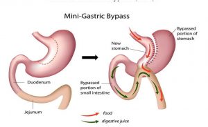 Laparoscopic Mini Gastric Bypass (LMGB)/ Single Anastomosis Gastric Bypass (SAGB) | ![]() | First described by Robert Rutledge in 2001, this surgery has quickly gained popularity throughout the world. Stomach is divided at junction of body and antrum to create longest possible gastric pouch. A lesser curvature based tube of stomach is constructed over a bougie using staplers. A jejunal loop 150-200 cm distal to the Ligament of Treitz is brought antecolic and anastomosed to the stomach tube. |