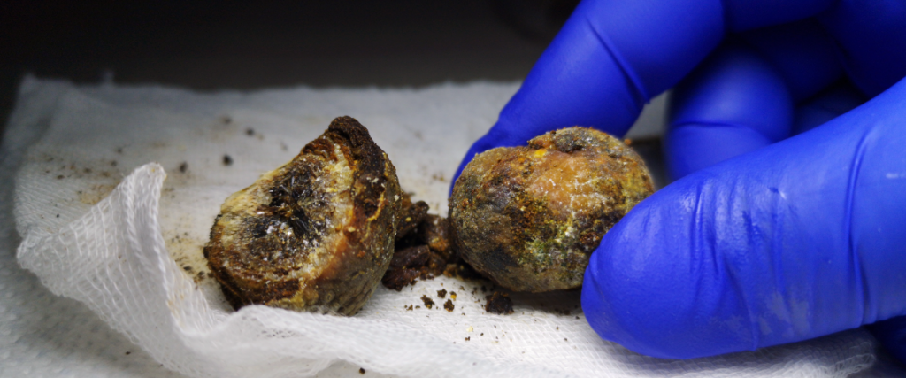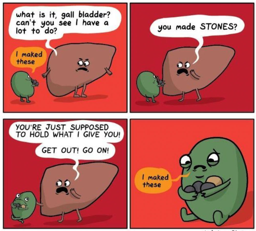 10-15% of adults develop gallstones. Gallstones form in the gallbladder, most commonly due to an imbalance in the chemical constituents of bile.